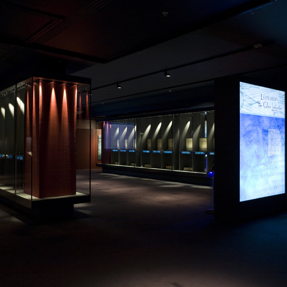We travelled west to Dublin, Eire, to work with the Chester Beatty Library in 2007. The Library was proud to temporarily display the so-called Codex Leicester – famously purchased by Bill and Melinda Gates in 1994 and rarely on public display. The Codex is widely considered to be one of Leonardo’s most important illustrated scientific manuscripts, in which he ponders a number of subjects, including hydrology, astronomy and geology. Its pages are peppered with theories, experiments and observations: it is a wonderful window into the ceaselessly enquiring mind of the great man. Here, Goppion provided the display cases for the precious manuscripts.