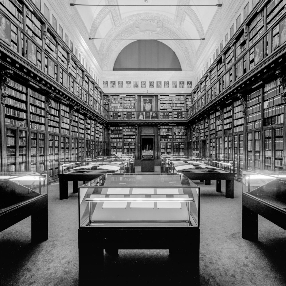 Also in Milan, at the Ambrosiana Library, we created special modular table cases for the first public display of the Atlantic Codex. The twelve large-format bound ‘atlas’ volumes contain many original signed drawings and notes by Leonardo, along with work by his students – in all numbering well over a thousand pages. Their fragility and rarity required stringent protective measures against theft, light exposure and inadequate micro-climate, plus support to avoid tension on the volume bindings.