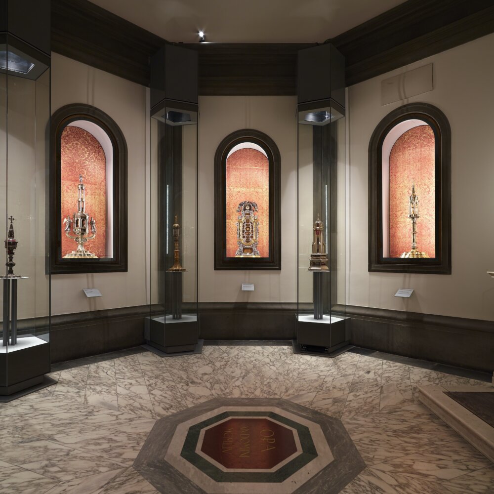 Commissioned to develop the new display arrangement, Goppion created cases that combine state-of-the-art performance with a refined aesthetic sensibility. Goppion manufactured the special display case for Ghiberti’s Gates of Paradise, and matched it with twin cases for the North Door, also by Ghiberti, and for the South Door, by Andrea Pisano. Sculptures that originally appeared above the doors are placed above the monumental cases, highlighting their key role as Gothic art began its metamorphosis into Renaissance art. The fragile, precious baptistery doors required exceptionally airtight cases that would ensure stable relative humidity levels below 15 percent to prevent the gilded areas from oxidizing. The 3 cases are equipped with an electrical advancement system to allow maintenance and to adjust their position in relation to sophisticated LED lighting systems that provide dimming and color temperature options. Goppion also created special display cases for other masterpieces in the museum, such as Donatello’s Mary Magdalene and the objects that comprised the cathedral’s treasury, including the stunning silver altar in the baptistery. There are fifty display cases altogether, all of which contain overpressure climate control systems that prevent unfiltered air from entering the cases. The compressors and ductwork for filtering and distributing the air directly into the individual cases are integrated into the surrounding architectural structure, and thus completely hidden from view. Goppion developed an extremely wide array of cases for the project, customizing each one to suit the object and the context in which it would be exhibited. We likewise refined the opening system technologies employed, which range from simple hinged doors to motorized pantograph lifting mechanisms and sophisticated systems of coaxial screws engineered specifically for this project. The large display case containing vestments deserves special mention, fitted as it is with special climate-controlled drawers for the conservation of articles that are not on display. Each drawer incorporates a shock absorbing system to protect the objects within as the drawers open or close.
