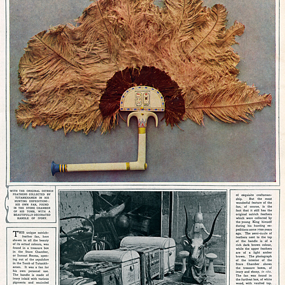 One of the many treasures found in the inner part of the tomb was a fan belonging to Tutankhamun, made from ostrich feathers with an ivory handle beautifully decorated with gold and lapis lazuli. The ostrich feathers were collected by the young king on a hunting expedition more than 3,000 years ago, and like many artifacts from the tomb, are remarkably well preserved.